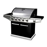 Grill zone, 5 burner, lp gas grill, with 1 side burner, stainless steel and black, 5 stainless steel tube burners total 55000 btus plus a 12000 btu side burner, cooking area totals 805 square inch, porcelain coated cast iron cooking grates: 35-inch by 17-inch, porcelain coated steel warming rack: 35-inch by 6-inch, 5 porcelain coated steel flame tamers, integrated push and turn ignition system with chrome plated control knobs, stainless steel control panel, 2 side shelves with stainless steel front panel and painted table, double layer stainless steel lid with black end caps and stainless steel handle, powder coated steel trolley with 2 front doors, stainless steel handles and 4 casters.